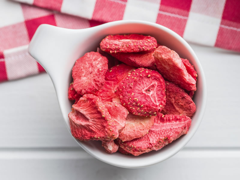 With hot-air drying, texture shrinks more and aroma may diminish. Freeze-dried products are light, crisp, and intensely flavorful; when in contact with water, they quickly return close to their original form.
