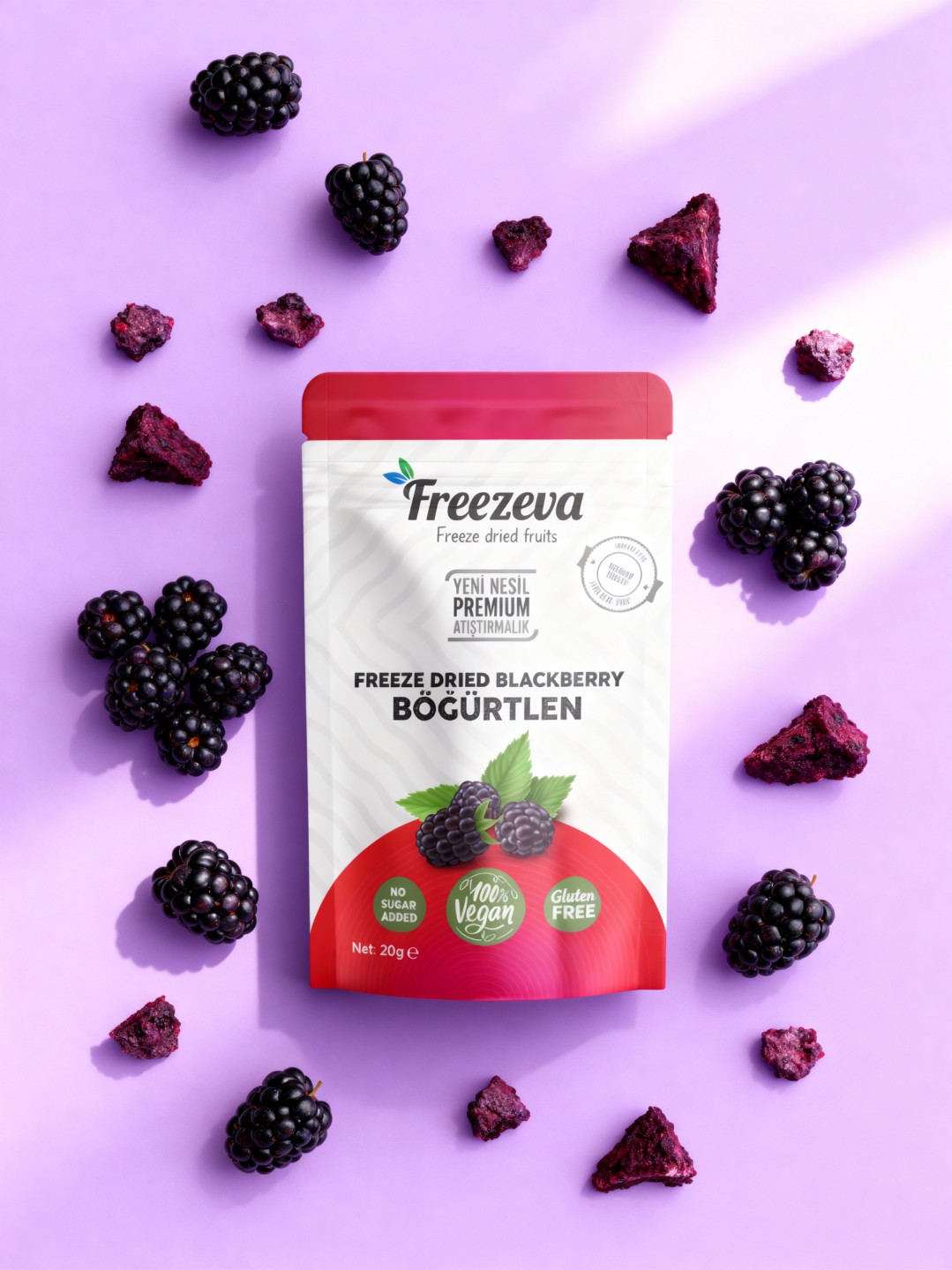 Doğanın güçlü ve karakterli meyvelerinden böğürtlen, hasadının ardından dondurularak freeze-dry teknolojisiyle özenle kurutulur. Böylece mor-siyah tonlarındaki cazip rengi, yoğun aroması ve kendine has ekşi-tatlı dengesi korunur. Katkısız, koruyucusuz ve ilave şeker içermeyen bu sağlıklı atıştırmalık; granola ve yoğurt kaselerinde, tatlılarda ya da tek başına tüketildiğinde damakta unutulmaz bir iz bırakır.