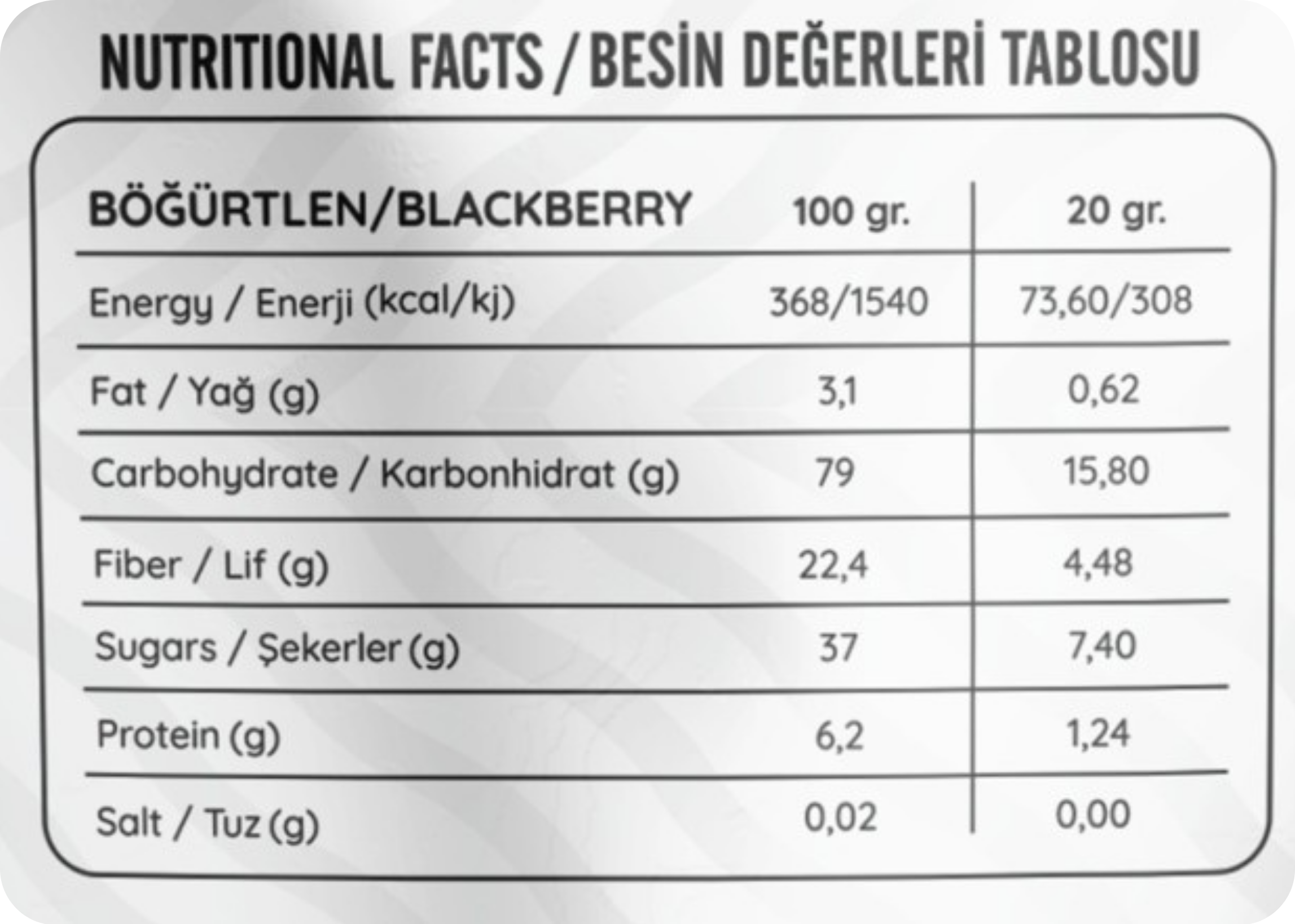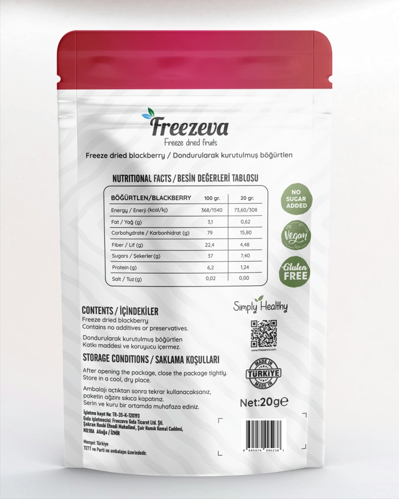 Doğanın güçlü ve karakterli meyvelerinden böğürtlen, hasadının ardından dondurularak freeze-dry teknolojisiyle özenle kurutulur. Böylece mor-siyah tonlarındaki cazip rengi, yoğun aroması ve kendine has ekşi-tatlı dengesi korunur. Katkısız, koruyucusuz ve ilave şeker içermeyen bu sağlıklı atıştırmalık; granola ve yoğurt kaselerinde, tatlılarda ya da tek başına tüketildiğinde damakta unutulmaz bir iz bırakır.